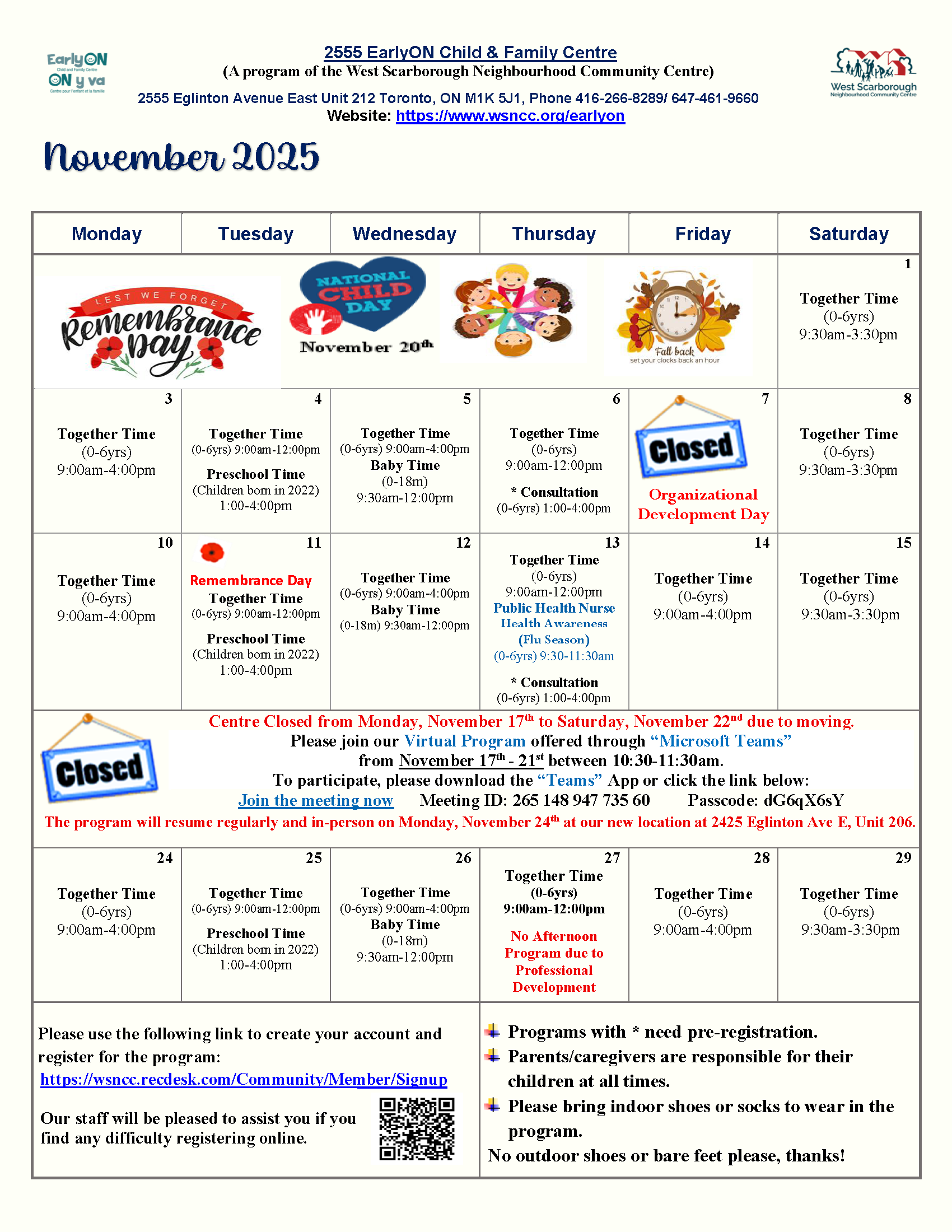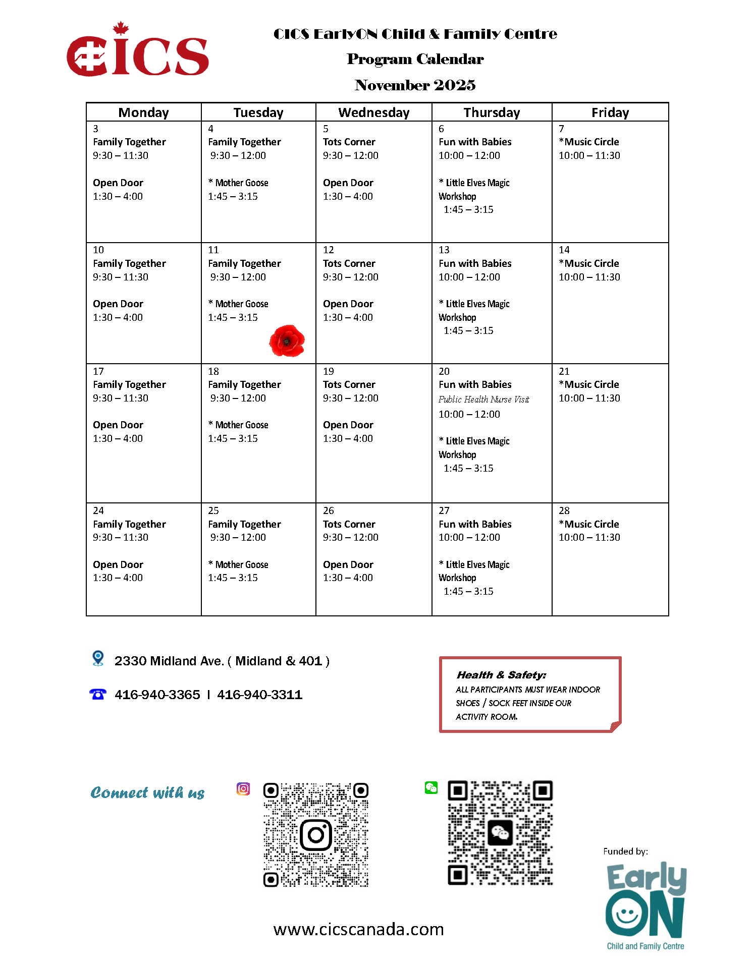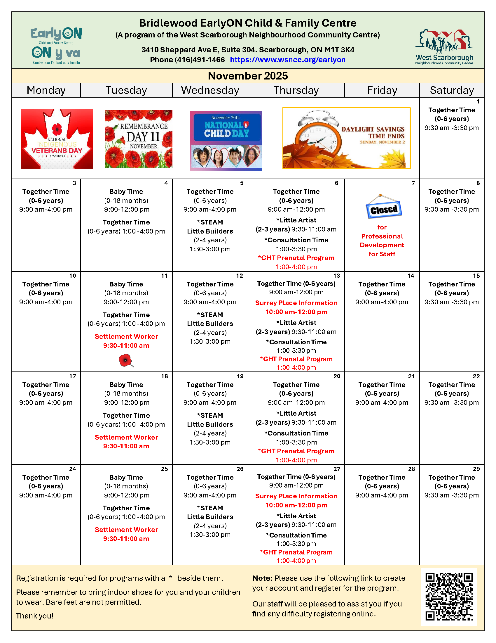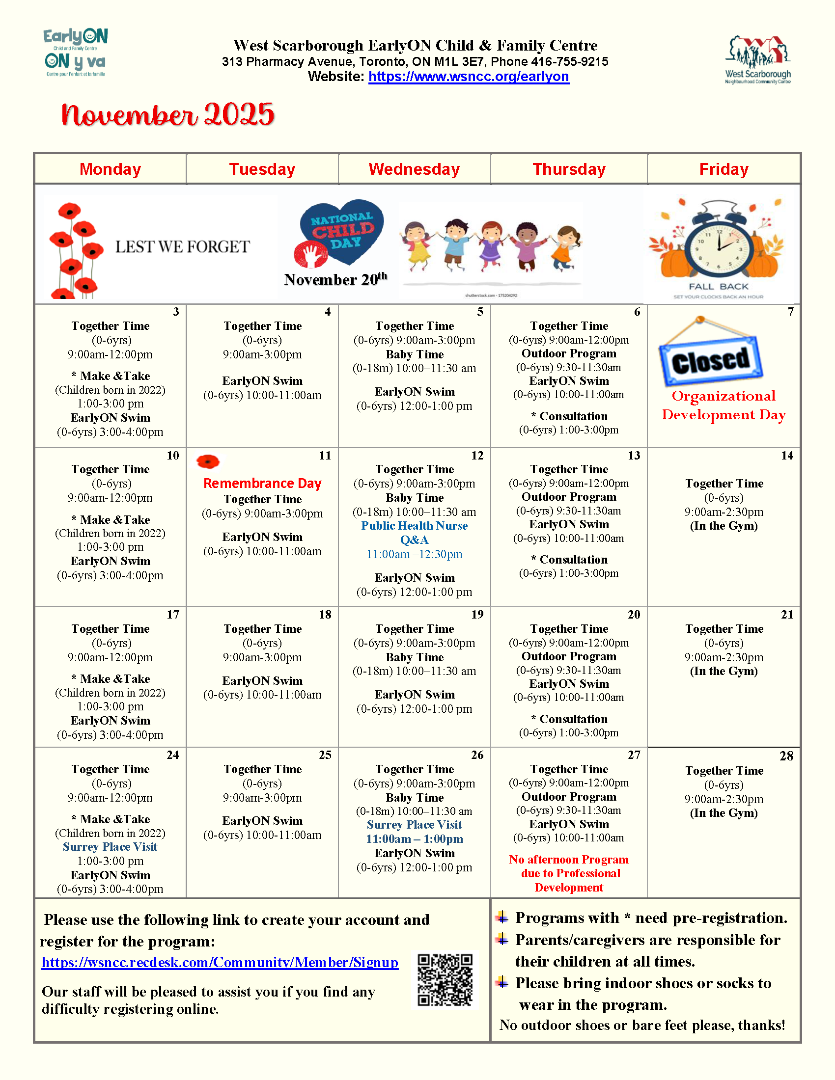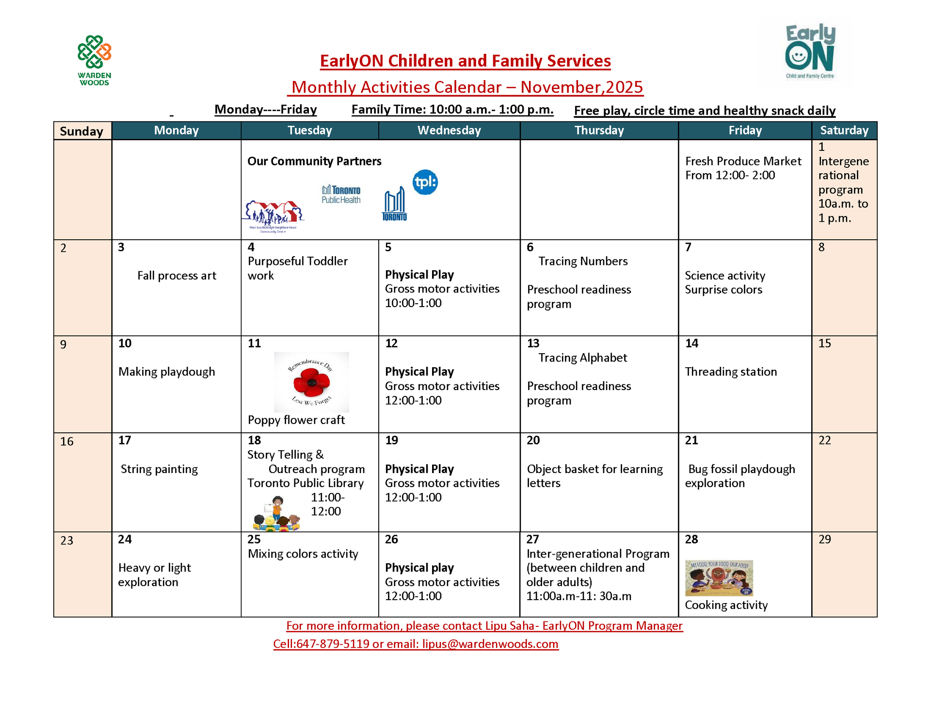 EarlyON Centres provide free, high-quality drop-in programs designed for families and children from birth to age 6. These welcoming spaces offer opportunities to learn and play together, connect with other families, and receive guidance from experienced early childhood professionals in a supportive environment.