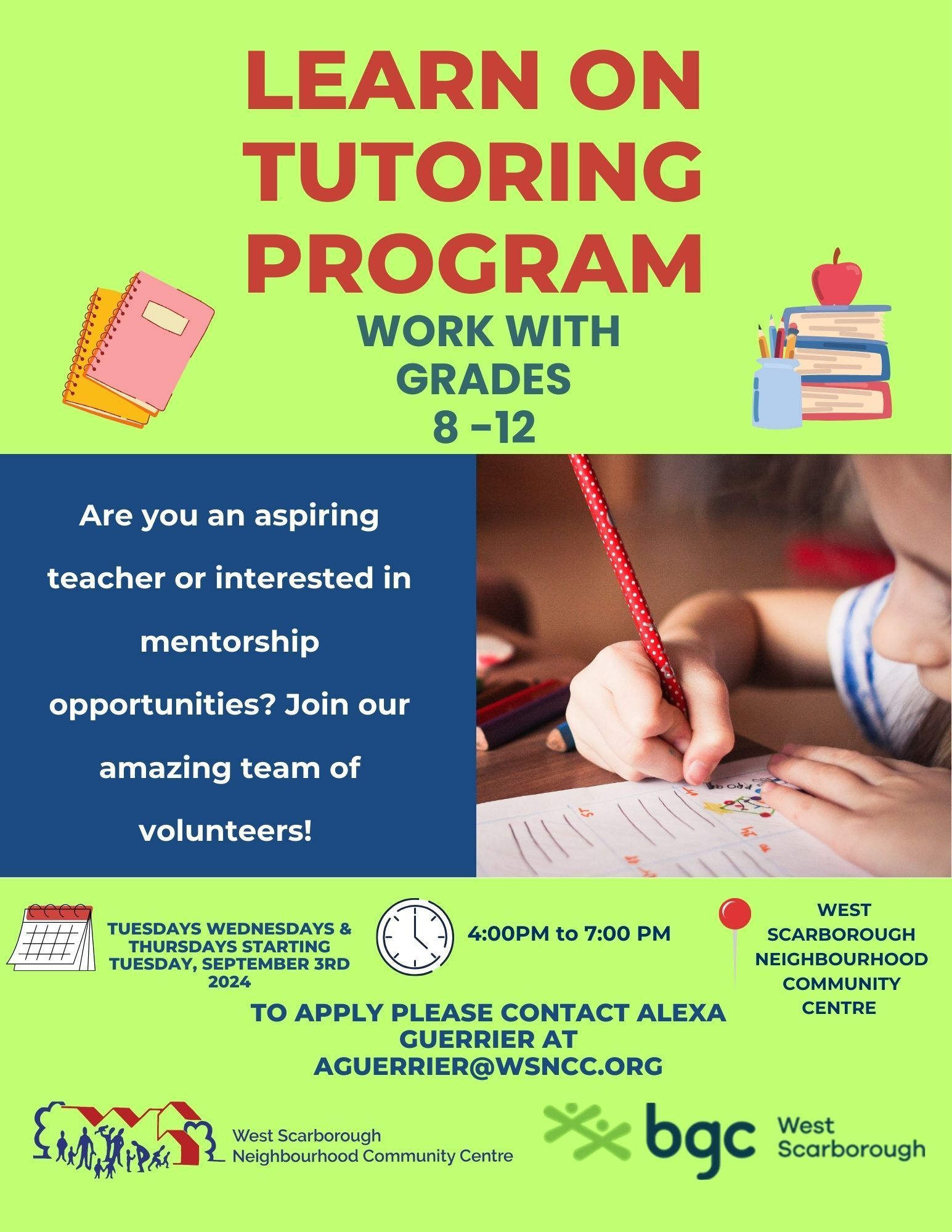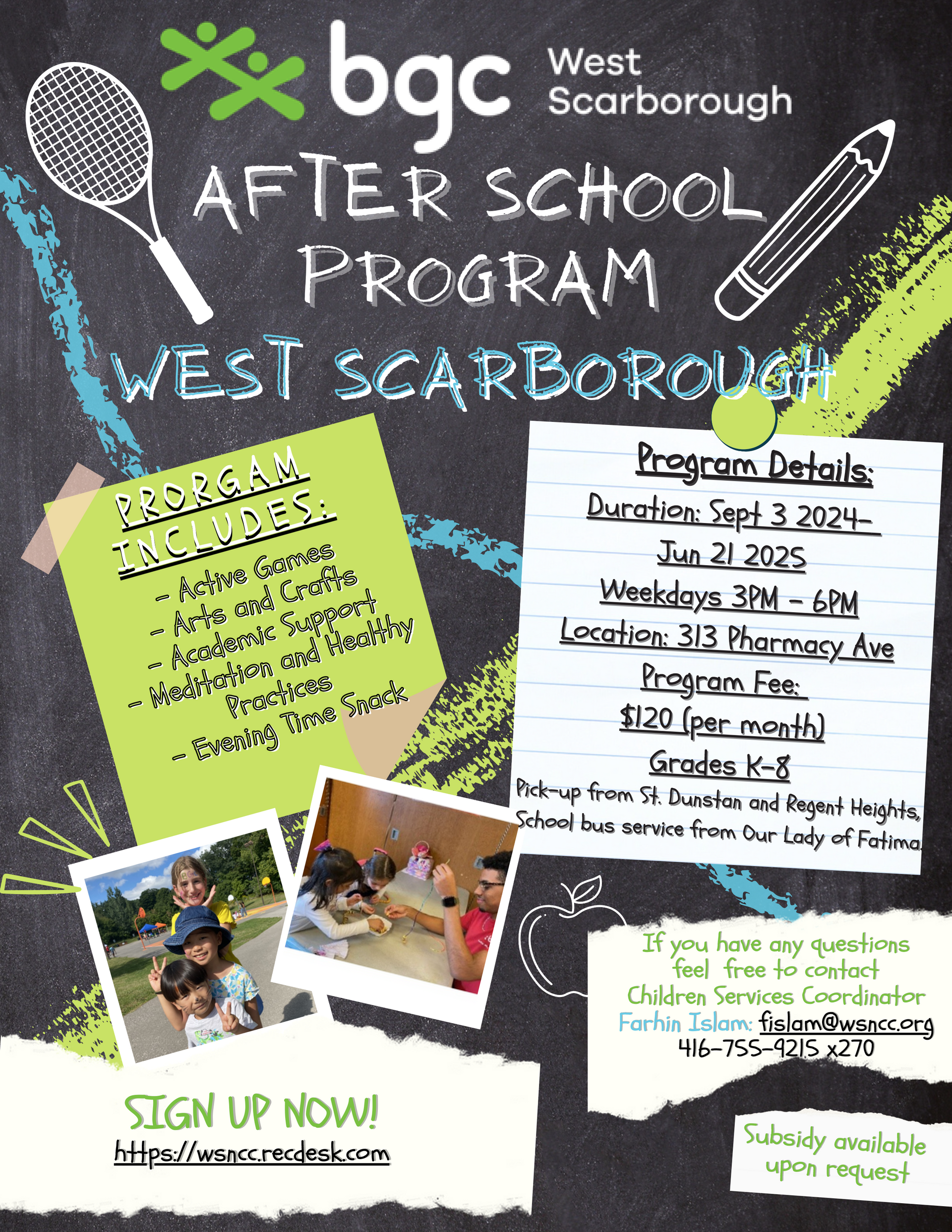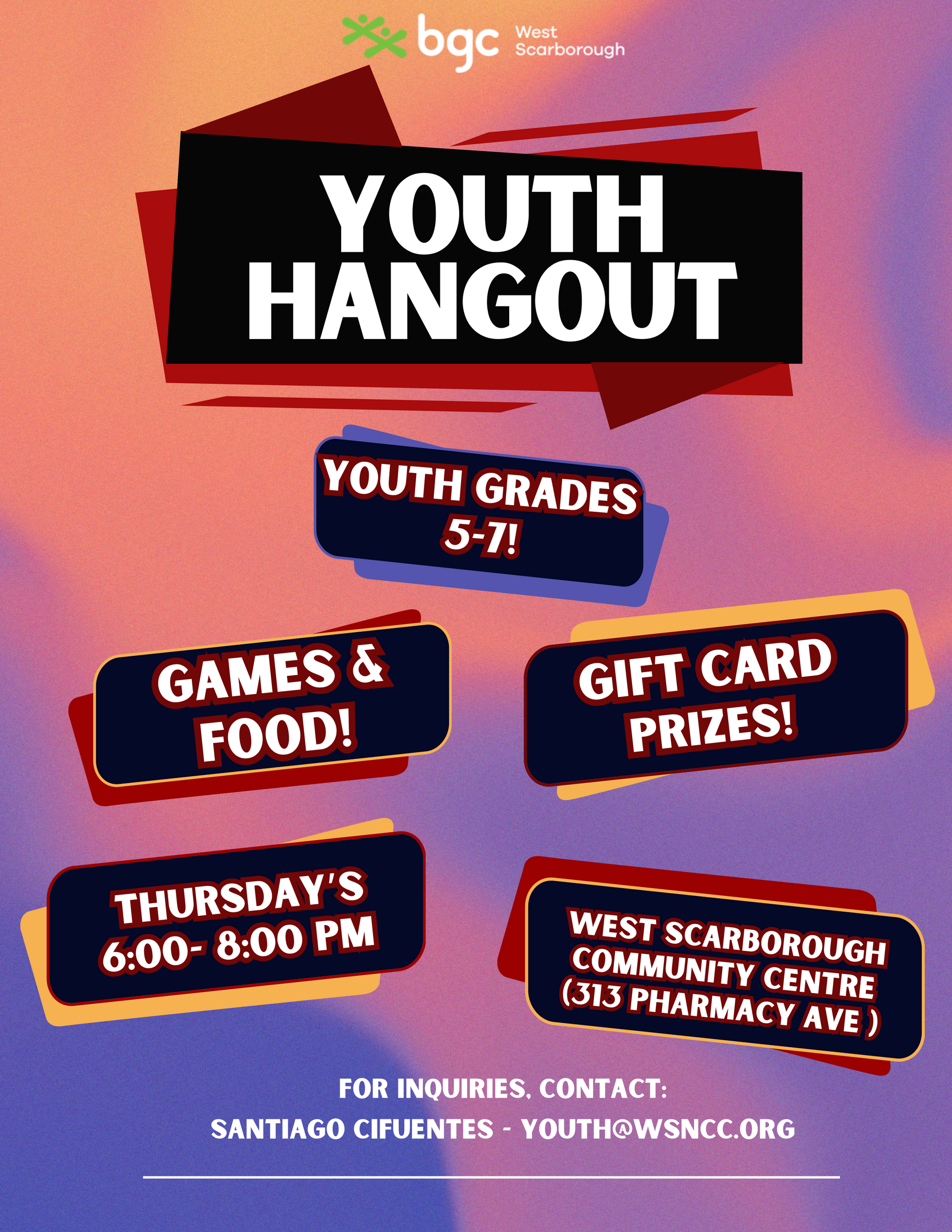 Les programmes parascolaires du BGC rouvrentArticlePublié le 29 août 2024 Les programmes parascolaires du BGC West Scarborough rouvrent le 3 septembre, offrant un soutien scolaire, des activités artistiques, sportives et de leadership dans un environnement sûr. Cliquez sur le lien pour en savoir plus !