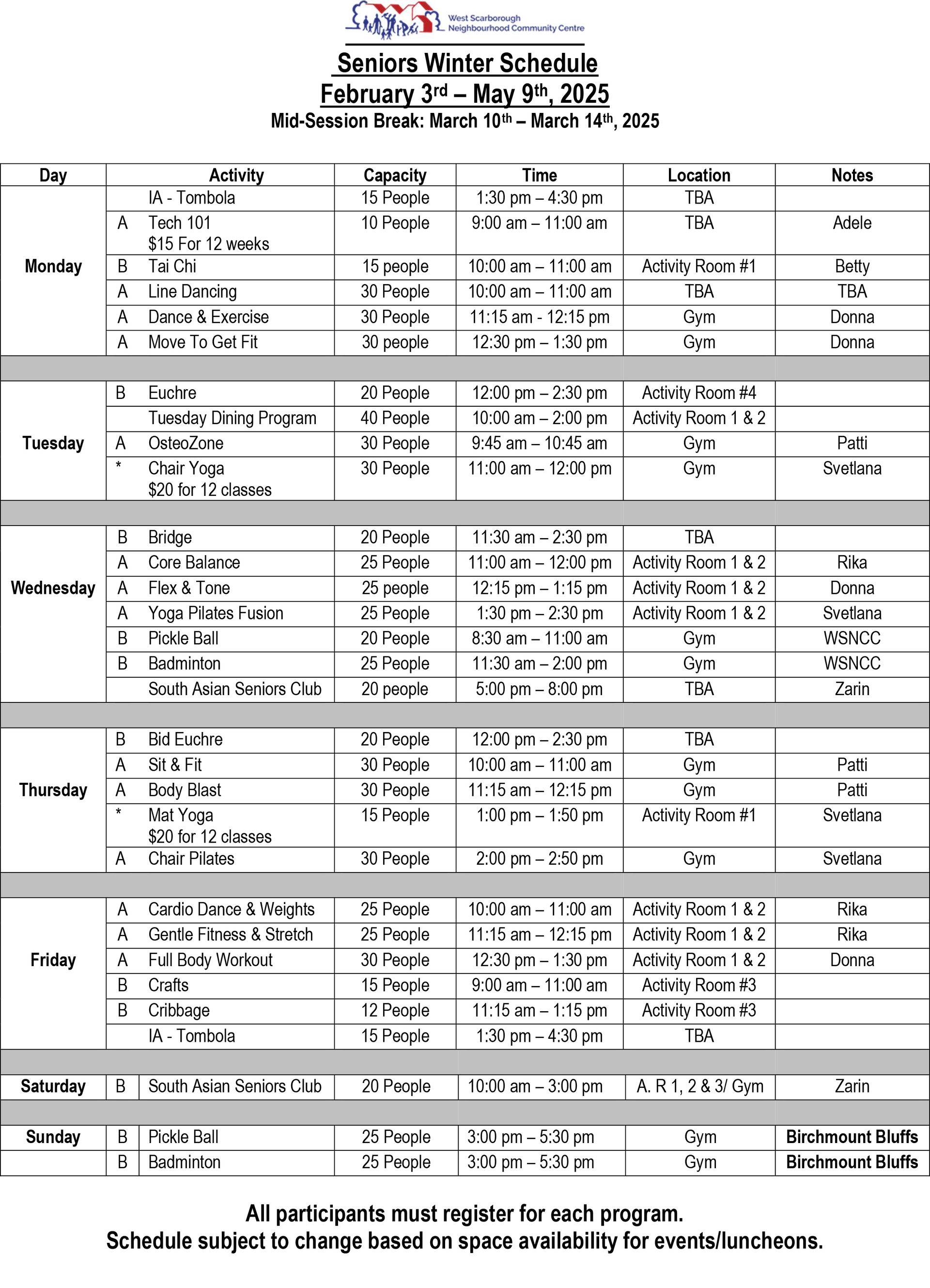 Le West Scarborough Neigbourhood Community Centre propose des programmes inclusifs et multiculturels qui favorisent la participation communautaire, la croissance personnelle, la santé et le bien-être général des aînés et de leurs familles. Être à la retraite est l'un des plus beaux moments de votre vie, mais vous manquez peut-être l'aspect social du travail et de l'activité physique. Nos programmes pour aînés sont fantastiques ! Des programmes de conditionnement physique et de yoga aux après-midis de cartes et de badminton, les programmes pour aînés sont conçus pour vous garder actif et vous aider à rencontrer d'autres personnes de votre communauté ayant des intérêts communs.
